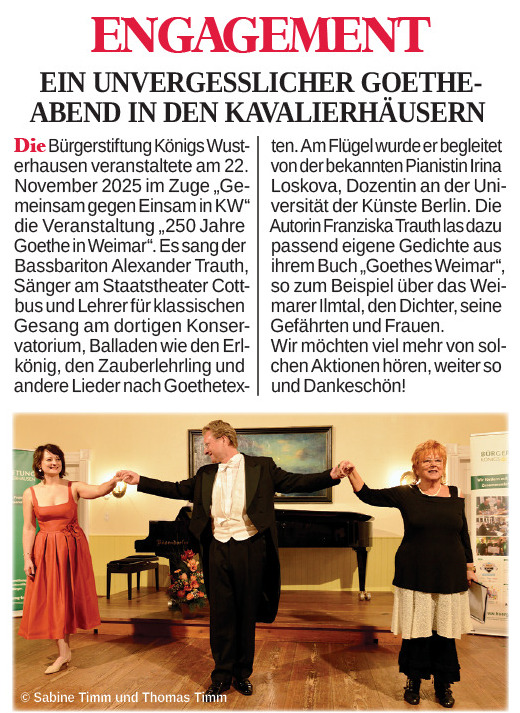 Heute, 250 Jahre später, singt der Bassbariton Alexander Trauth, Sänger am Staatstheater Cottbus und Lehrer für klassischen Gesang am dortigen Konservatorium, Balladen wie den Erlkönig, den Zauberlehrling und andere Lieder nach Goethetexten. Am Flügel wird er begleitet von der bekannten Pianistin Irina Loskova, Dozentin an der Universität der Künste Berlin. Die Autorin Franziska Trauth liest dazu passend eigene Gedichte aus ihrem Buch "Goethes Weimar", so zum Beispiel über das Weimarer Ilmtal, den Dichter, seine Gefährten und Frauen.