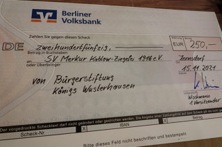 Die Bürgerstiftung Königs Wusterhausen spendete 500,- Euro für den Förderverein Netzwerk Senzig für den Druck des Wanderführers, 250,- Euro für den SV Merkur Kablow-Ziegelei 1916 e.V. für seine Kinder- und Jugendarbeit, 250,- Euro für den Männerchor "Freie Sänger" Zernsdorf.